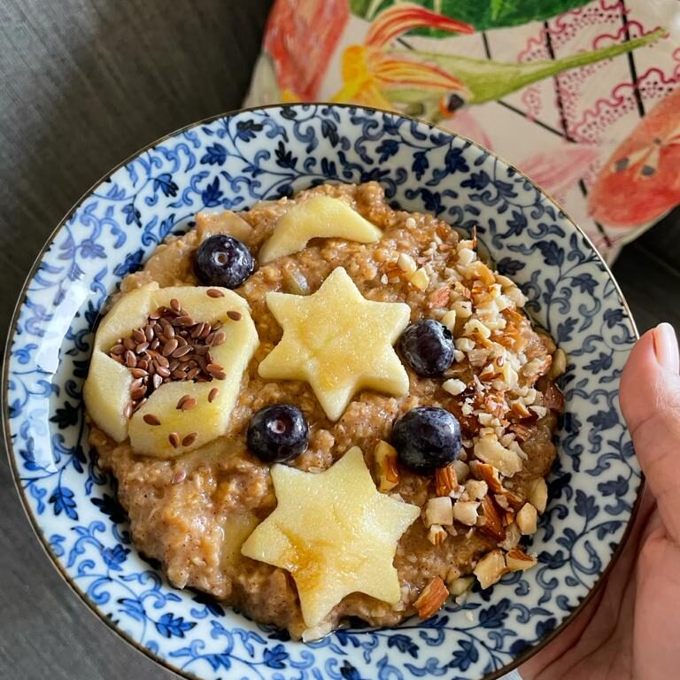 Apple cinnamon pie oatmeal is dessert in a breakfast bowl. This snack is sans calories.